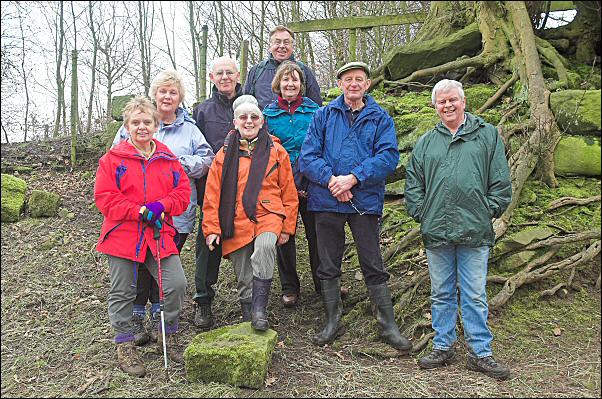 | A wide range of historical aspects were covered on the walk including the significance of water stop valves in the highway pavement to the line of the Thirlmere aqueduct. The weather was overcast and dry as we set off but by the time Ollerton Fold was reached the drizzle had started. Three tennon top gateposts almost all in a straight line set our imaginations off. An interesting descent via Whave’s Lane took us to the Leeds & Liverpool canal where we returned to Withnell Fold and the site of the old Paper Mill. |